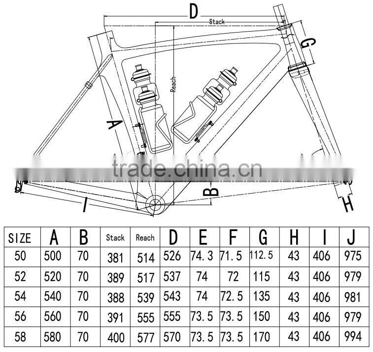 1. Weight: 1050+-40g (frame) 2. High Modulus carbon fiber T800. 3. Fit Di2 4. Full inner cable routing 5. Aero design----Reduce the windage, increase the speed. 6. New design in 2014. | ||||||||||||||||||||||||||||||||