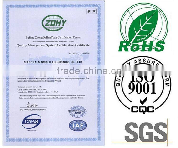 Shenzhen Sunwoald Electronics Co., Ltd.was established in 2006, and is engaged in the development, production, sale and services of proximity sensor , magentic reed switches , flow switches ,flow sensors ,level float sensor , float switch , door magnetic switches, magnetic reed relays and infrared sensors.