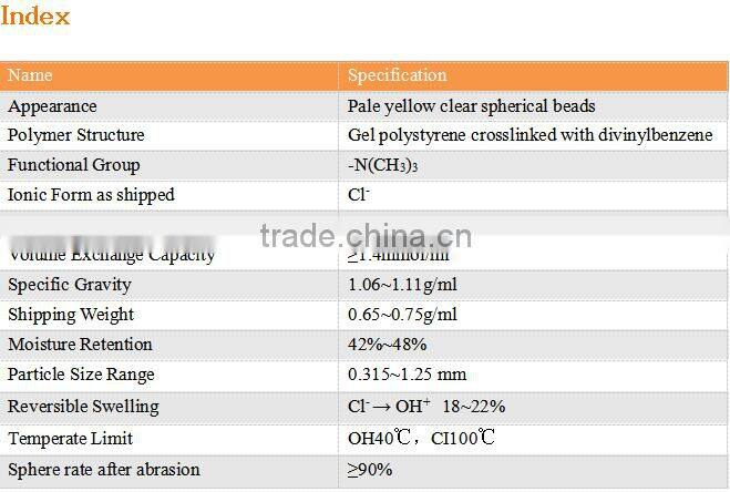 LIJI TECH ™ 201×7 is a polystyrene matrix gel type strong basic anion exchange resin, containing -N (CH3) 3, equivalent to the solid alkali.With high mass full Exchange capacity and good mechanical strength. Mainly used pure water preparation, wastewater treatment,biochemical products and extraction of gold, silver, tungsten, molybdenum etc in wet metallurgy industry.