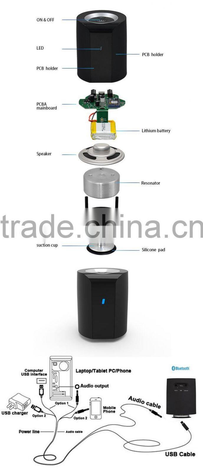 Glass is the clearest sound and most suitable for high frequency music. To enjoy rich bass try placing the speaker on wooden surface, such as a table or desk. Experiment with your speaker-it’s part of fun-try it on a door, or fix it to be a plasterboard wall(receive permission if you don’t own the wall).