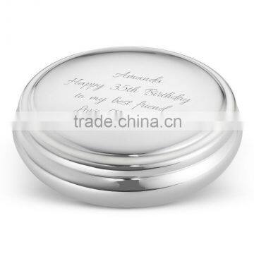 Engrave a message of love, friendship or inspiration on this polished pewter personalized keepsake box. Designed with clean lines and a domed lid, this box features a soft royal blue velveteen lining. | ||