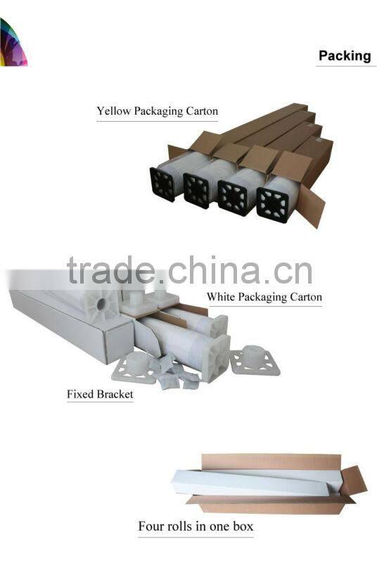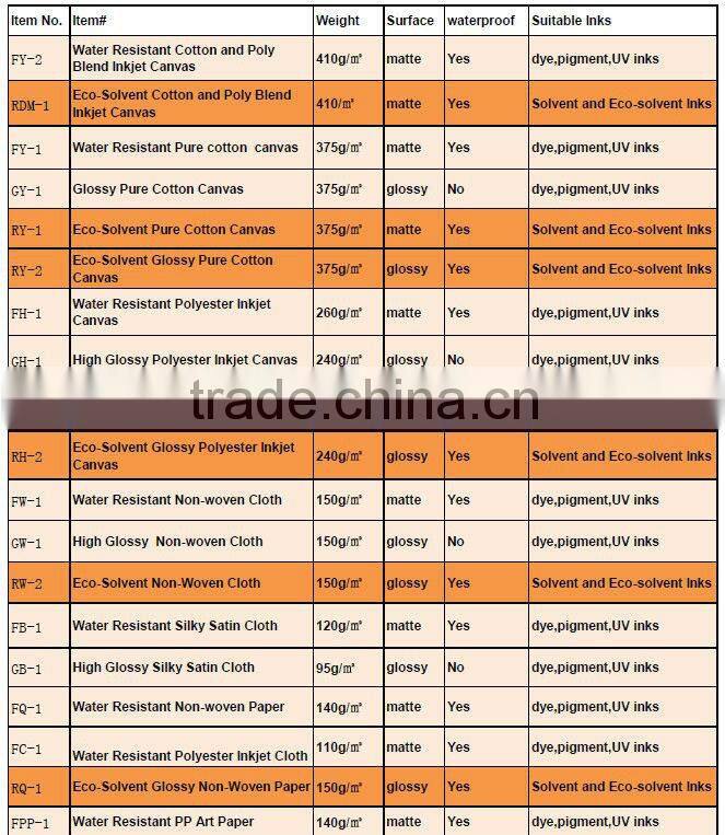 We have more than 10 series of products, including water-proof art canvas (matte and glossy) for giclee printing, water-proof PP art paper (with self-adhesive), water-proof silky satin cloth, high glossy silky satin cloth, water-proof non-woven cloth, water-proof back-lit vinyl/front-lit vinyl cloth and water-proof PVC cloth. We also offer OEM products based on customers' requests.