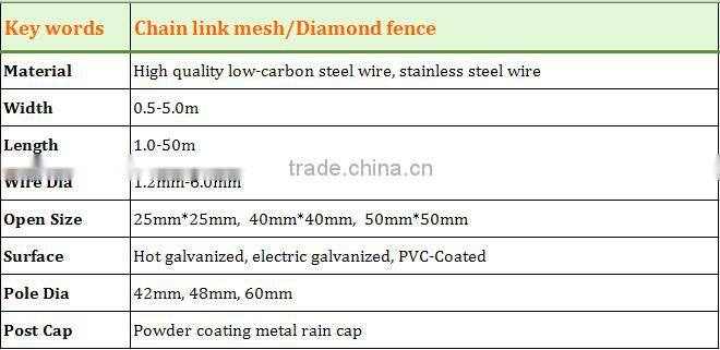 Chain link wire fence also named diamond Wire Mesh, Chain Link fence, Galvanized Chain Link Fence and etc,using the woven steel wire to make the panel,mainly adopt the low-carbon steel wire, galvanied wire, stainless steelwire.installing with post, strut and other accessories.rolls are completed with line wires and knuckled edges