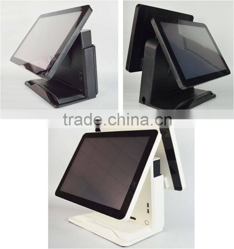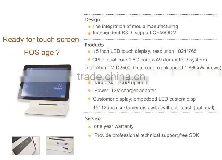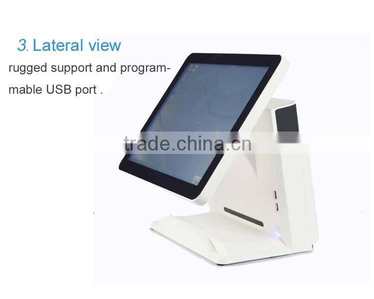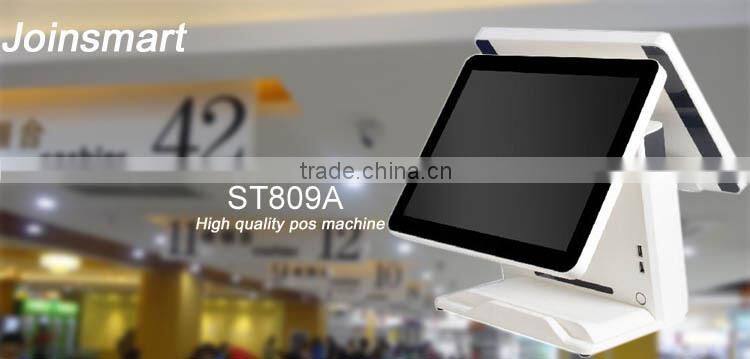 Joinsmart S809 touch screen POS terminal is a new professional 15” touch screen POS terminal with the multi function of 3G, WIFI, Bluetooth, Ethernet, USB, RS232, cash box, magnetic card, RFID, camera and thermal printer, support eternal keypad. The various and rich peripherals and high performance hardware make sure to offer more efficient, stable and safer complete solution for many fields. It is widely used for restaurants, stores , banks, transport, hotels, medical care, lotteries, clothing etc.