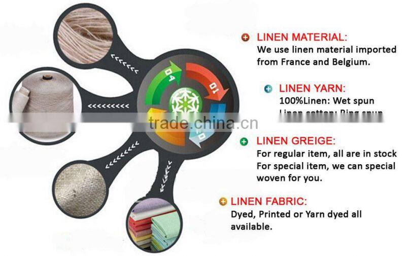*High quality linen fabric is our major products.We have been in this line for more than 25 years. We have mill to woven linen greige, we can supply all fabric with linen: linen greige, plain dyed, yarn dyed and printed. And we can control weight, width,shrikage,color fastness ,hand feeling very well.