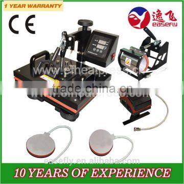 The digital combo heat press machine boasts all of the digital features of the state-of-the-art control system. It utilizes quickchange attachments for heat transferring images onto a surprisingly wide variety of materials, i.e. coated mugs, plates, tiles, mouse pads, jigsaw puzzles, T-shirts, caps, table mats, sublimation slippers, glass clocks, etc.