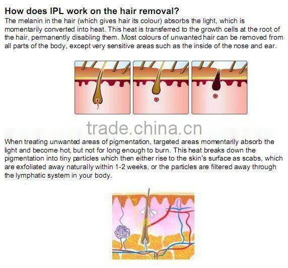 1.Remarkable effects on fuscous spot and live spot 2.Great effect on unwanted hair removal, both thick black hair and tiny hair, and comfortable during the treatment 3.Avoid burn, pigment mark and blister during former IPL treatment 4.Wide range of treatment, great effect, and with high safety factor 5.Large color touch screen, comfortable and elegant 6.Breakthrough based on traditional IPL technology |