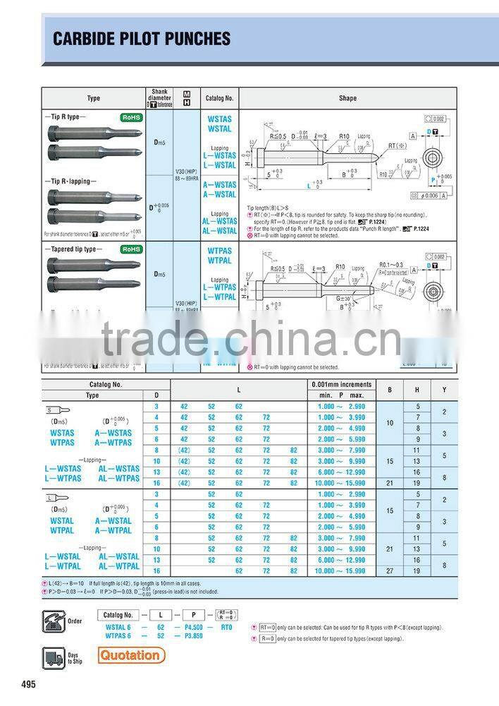 Long Life Hardened High Precision Tungsten Carbide Carbide Pilot Punches -Tip R Type- Normal, Lapping