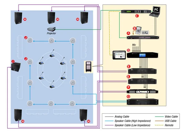 8) It's with interface for optical fiber to combine 2 conference room in different location without audio attenuation; and the system could be expanded via cascade and could work with central control system seamlessly.