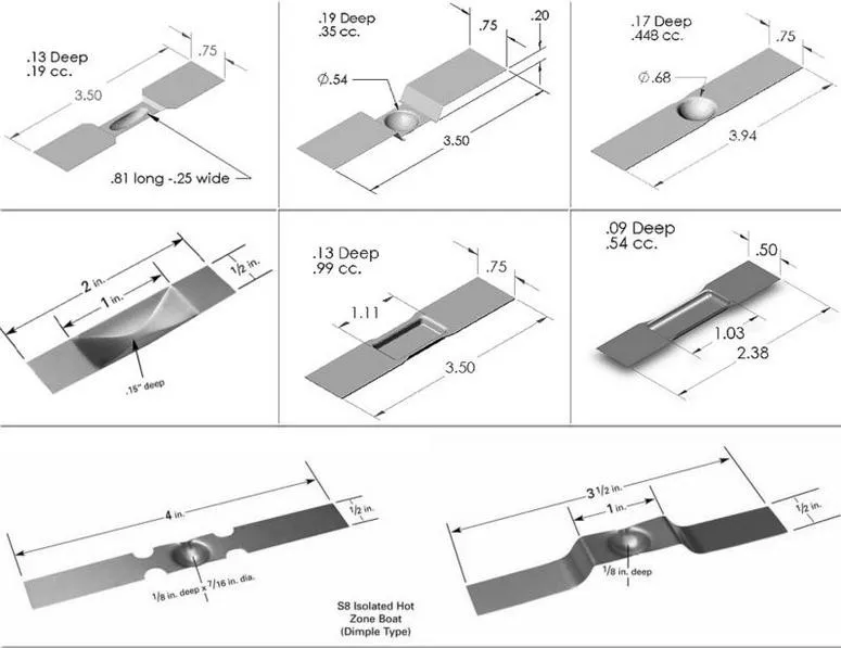 Molybdenum boats are made after processing molybdenum plates with cutting, folding, riveting and welding. The boat shapes can be molded according to customers' requirements, including round, rectangular, square, and trapezoidal and so on. Molybdenum boats own properties of source material - pure molybdenum, or molybdenum alloy.
