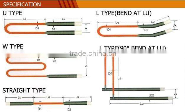 1800 Grade U- type MoSi2 heating elements can usually make use of furnace temperature from 1300 to 1900. It is extensively used in the industries of metallurgy, glass, ceramic refractory, crystal electronic device, industrial furnace manufacture, etc.