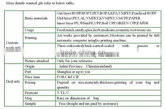 | Material | Laminated Material | Material Structure | BOPP/VMPET/PE | |