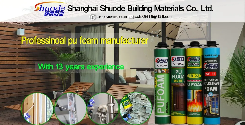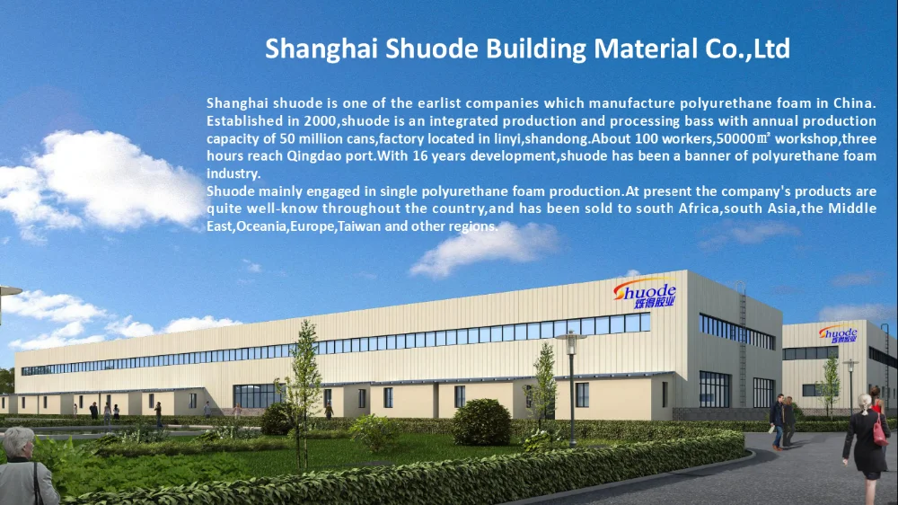 Shanghai shuode is one of the earlist companies which manufacture polyurethane foam in China. Established in 2000,shuode is an integrated production and processing bass with annual production capacity of 50 million cans,factory located in linyi,shandong.About 100 workers,50000㎡ workshop,three hours reach Qingdao port.With 16 years development,shuode has been a banner of polyurethane foam industry.