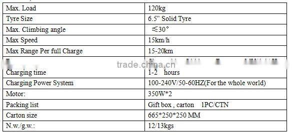 | Range Per Charge | Other, 15km | Tire Size | 6.5 Inch |
