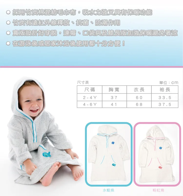 Hooded Robel in soft, thick Cotton Bamboo charcoal towelling. Naturally anti-bacterial, anti-mildew and super absorbent. Draws moisture away from the body leaving your little one dry, warm and cosy after a dip in the pool or bath. Ideal for on the beach, feeling warm whilst looking cool ! Extra roomy fit across the shoulders, front pocket, deep hood and front opening, mid calf length. Gorgeous embroidered fish detail on the hood matches the piped edges. Smartly presented in reusable packaging, idea to take swimwear to and from the pool. UPF max 50+