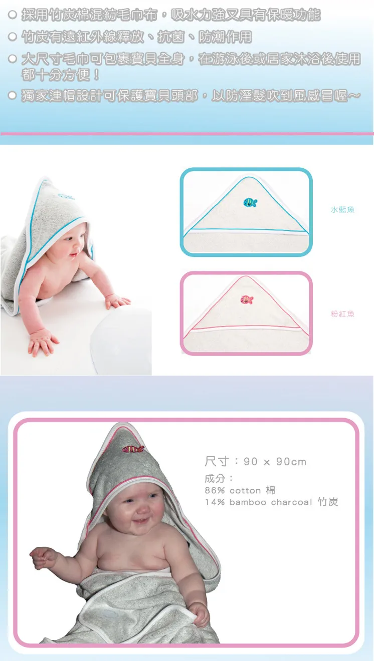 Hooded Towel in soft, thick Cotton Bamboo charcoal towelling. Naturally anti-bacterial, anti-mildew and super absorbent. Draws moisture away from the body leaving your little one dry, warm and cosy after a dip in the pool or bath. Extra large (35" x 35"; 89cm x 89cm) so that it lasts longer than the first few months and you can really wrap them up ! Gorgeous embroidered fish detail on the hood matches the piped edges. Smartly presented in reusable packaging, idea to take swimwear to and from the pool. UPF max 50+