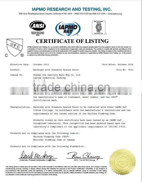 6. The walk in tub have passed the CE certificate and the shell with the CUPC, UPC and ETL certificate, Also the motor can be used UL certificate motor.