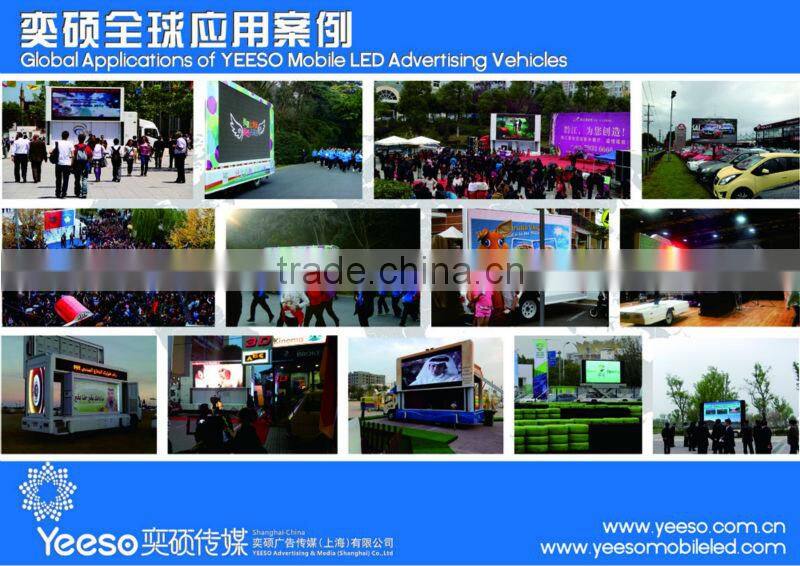 Yeeso focuses on providing a comprehensive solution of outdoor mobile advertising vehicles. At any budget, in any size, for any issue, you will find your ideal and unique promotion solution here. We have different series of mobile advertising vehicles such as LED truck series, LED trailer series, LED container series, installable series, mini series and light box series etc, which can be applied to brand promotion, sales promotion, road-show cruise, public election, sport events, popular concerts, festivals, exhibitions and political campaigns etc.
