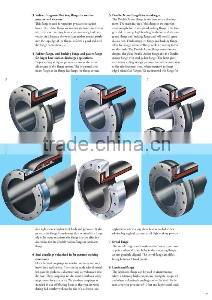 Coupled with standard built-in steel nipple/150#RFSO flanges. Available in other bolt hole patterns, materials and floating flanges on request. Swage nipples are offered up to 10". Hose assembly is electrically continuous unless otherwise specified by customer.
