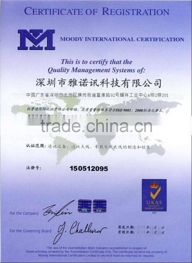 Shenzhen Yetnorson Technology Co.,Ltd is one of professional antenna maker, which focus on GSM/CDMA/PHS/3G/4G antenna, 2.4GHz (wi-fi, wlan)/3.5GHz (wimax)/5.8GHz/wi-fi amplifier communication antenna serial(including: all direction, yagi antennas ,3G parabolic antennas, panel antenna, indoor antenna like : ceiling mount antenna, Wall Mount Antenna, desk antenna, double polar, rubber, bandwide, card mount serial antenna. We also provide DVB-T/DMB-T/CMMB moving digital TV antenna, low frenquency antenna: 315MHz/433MHz wi-fi digital /wi-fi control /wi-fi wrote water meter/electricity meter antenna, GPS guide antenna, communicate parts, connector and so on. At present, Shenzhen Yetnorson Technology Co.,Lth.has developed more than 100 styles of antenna, with wi-fi internet, wi-fi electronic control, wi-fi end, wi-fi public telephone, wi-fi digital pass, wi-fi Satilla position, wi-fi Radio broadcasting communication field. We offer antennas with good quality and good price. And we are cooperating with several overseas clients from all over the world. Please support us. Thank you very much!