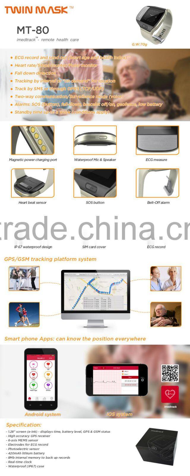 professional ecg/ekg monitor / vet ecg system devices gps watch tracker MT80