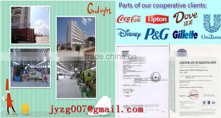 ![]() | Normal Material:0.23mm thickness first grade tinplate Size: Customized Printing:CMYK,4C offset printing for outside, clear or gold varnish for inside or according to your artwork and requirement Payment :L/C, D/A, D/P, T/T, Western Union, Money Gram, cash etc... 1. relative sample is free 2. your design artwork sample need to charge the printing cost, around USD500 and offer 5-10pcs sample for check 3. sample delivery bearded by client’s |