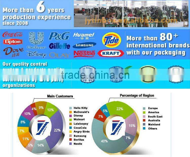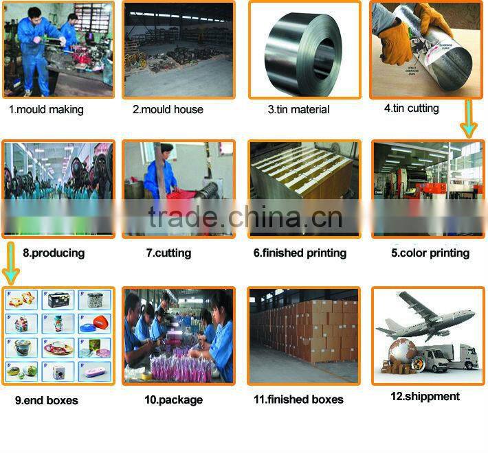 | 1. Q: What is tinplate? Are printed tins safe for food? A: Tinplate is the steel electrolytically coated with a fine layer of tin for tin protective purposes. Tinplate is a highquality safe packaging material for food items. such as cookies candies, chocolate, etc. A food grade lacquer is coated on the inside of the tin to prevent corrosion and interaction of the tin with the food product and thus make it suitable for food storage. 2.Q: Can I get a price list ? A: We do not provide a list to our customers. All items are quoted individually. As we know, the price can be effected by several factors, such as material thickness, product shape, size, order quantity, print colors, etc. Also, the material prices can change constantly. Please tell us your requirements and we shall find the best solution for you. 3.Q:What are CMYK & RGB? A: In offset printing "Four color" and "Full color" mean the same thing. "Full color" represent the four primary printing colors, Cyan(C), Magenta(M), Yellow(Y), and Black/Key(K), also known as CMYK. Your computer scgreen and in most programs are likely formatted in RGB color space (Red, Green, and Blue). In offset printing you can not use RGB formatted and must cover it to CMYK. Please understand a color shift will occur in doing so. CMYK cannot reproduce RGB exactly the same and may need to be adjusted after the conversion. 4.Q:What about the lead time for mass production? | |||||||||||||||||||||||||||||