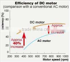 The DC motor allows fine rotation control, which reduces energy consumption. The motor also provides improvements in operational efficiency of up to 40%, compared to an AC motor. These improvements are particularly noticeable in the low-speed range.