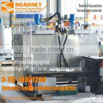YD700 Hydraulic double cylinder fusing kettle (thermoplastic paints pre-heater)using the patent technical. it has high-efficient of melting, mixing forward or turn over, mixing equality, easy to operation, convenient maintain. Special designed heating system, using imported high-efficient burner, saving energy sources and time.