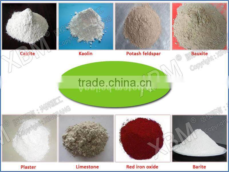 Firstly, raw material is crushed by jaw crusher to the size required and then the crushed materials are elevated into a hopper from which the material is transported through the electro-magnetic vibrating feeder, evenly and continously into the grinding chamber for power-processing. The rollers oscillater outward to press the ring because of the centrifugal force and the shovel scoops up the materials, send to the middle between ring and roller to accomplish the grind.
