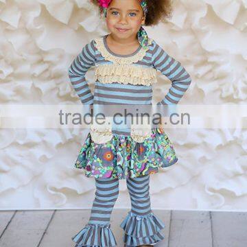 unique design fall winter 2pcs stripe ruffle boutique outfits with two pockets |