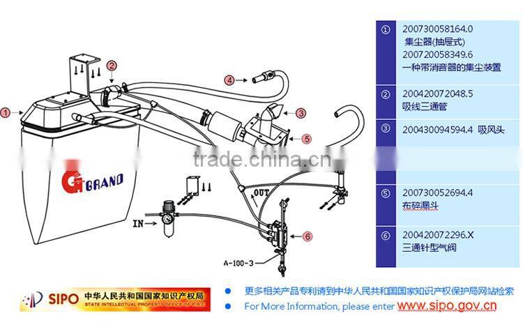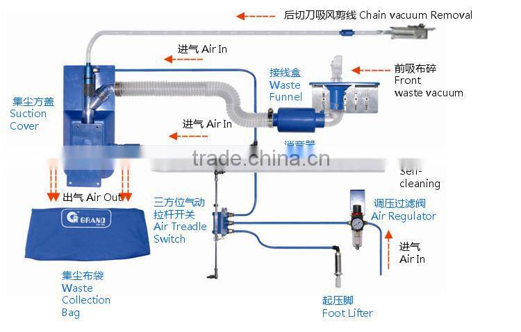 GRAND brand Chain cutter dust suction device works: air compressor pressure generated by the vacuum generator after amplification (or small vacuum motor) produces powerful suction, the former Qiebu inhalation trash, after priming package after the completion of the sewing inhalation internal sutures knife, aim to achieve by trimming blade reciprocates.