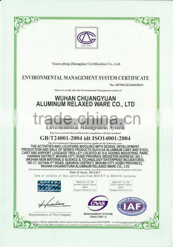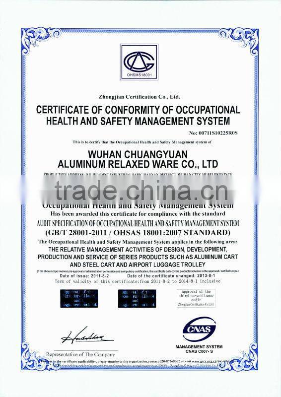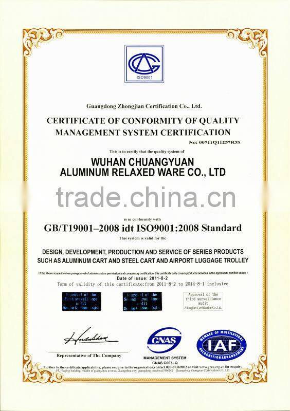 The Wuhan Chuang Yuan aluminum relaxed ware CO.,LTD registered in March 2000, under the airport luggage trolley manufacturing branch. Has passed the ISO9001: 2000 Quality Management System certification, ISO 14001: 2004 Environmental Management System certification and GB/T28001: 2001 Occupational Health and Safety Management System certification, has the right to import and export, Chinese civil aviation equipment procurement recommended.It is also the only enterprise specializing in the production of airport trolleys.