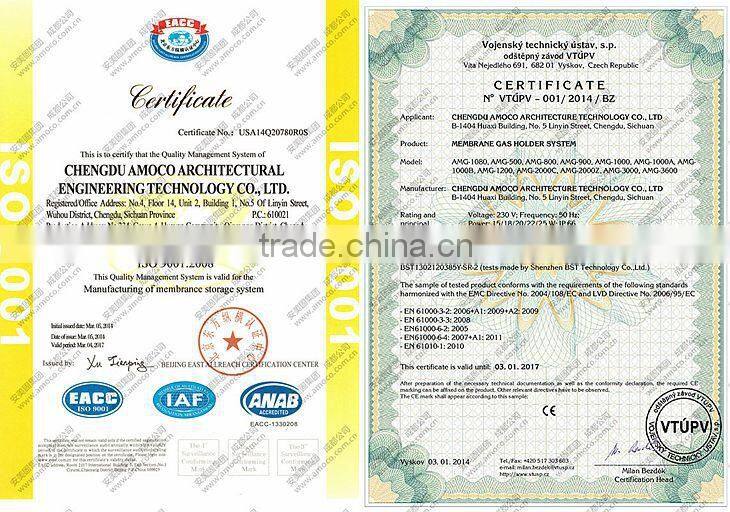 Outer membrane can be against static electricity, ultraviolet radiation and aging. Inner coat can be against biogas leakage, fire(Euro Standard B), abrasion, pleating and H2S;Biogas container is light in weight, lower weight pressure on tank body than steel tank top; Lower pressure of independent gas container on base, civil work investment can be decreased. No freezing problem in winter and can realize non-break operation.