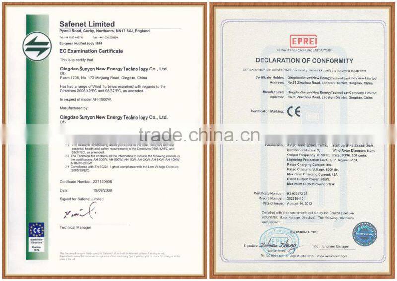 The company has passed ISO9001 quality management system; products have passed the EN61400-2 and CE certification. At home, the company works with China Mobile, China Unicom, Guodian Group, the State Grid Corporation, Goldwind, Poly Group, Dagang Oilfield, Rehau Group, Beiliang Group, Delta Electronics and other large enterprises, and provides a complete system solution to promote the small wind generators and water treatment in the domestic promotion and application. In abroad, this product has acquired the installation license from the traditional wind power technology countries, such as: Germany, Denmark; and bulk goods have been exported in North America, Europe, Australia, Southeast Asia, South Asia, Central Asia and other countries. It is highly praised by the users around the world.