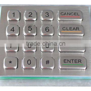 DESCRIPTION: 16 keys compact format IP67 dynamic water proof and vandal proof stainless steel industrial keypad with fully sealed & ruggedized industrial PCB connected to industrial electronics controller shielded & protected by stainless steel housing, carbon-on-gold key switch technology with long stroke (2.0mm) with extremely good tactile feeling for fast and accurate data input without any noise, with mounting holes on rear stainless steel plate for rear panel mounting. Which is good for outdoor application with direct rain and very harsh environments with humidity, much dynamic water, oil, dirt, salt mist etc, no rust risk and anti-salt spray corrosion.