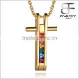 Gay & Lesbian Rainbow Cross Stainless Steel LGBT Pride CZ Pendant Necklace With Chain