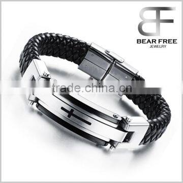 Fashion Solid Stainless Steel Cross Braide Leather Bangle Bracelet Men Jewelry