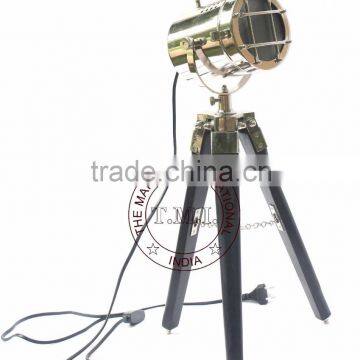 NAUTICAL SPOTLIGHT LAMP ON STAND - NICKEL PLATED SEARCHLIGHT ON WOODEN BLACK TRIPOD STAND