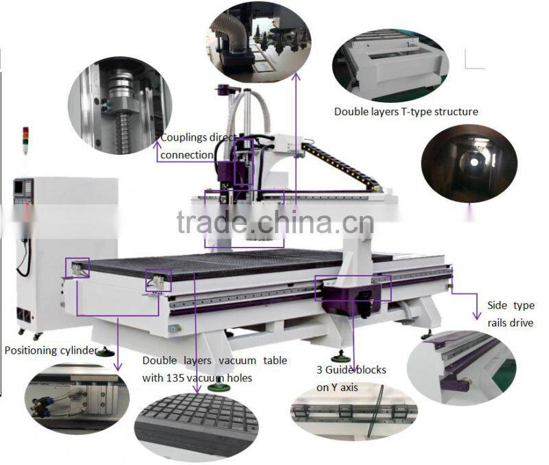 Side hang Taiwan CSK square rails with helical gear rack transmission,keep the machine with higher speed and precision.With dust proof for rails to improve the processing precision for 1325 ATC wood cnc router machinery in india cnc machine