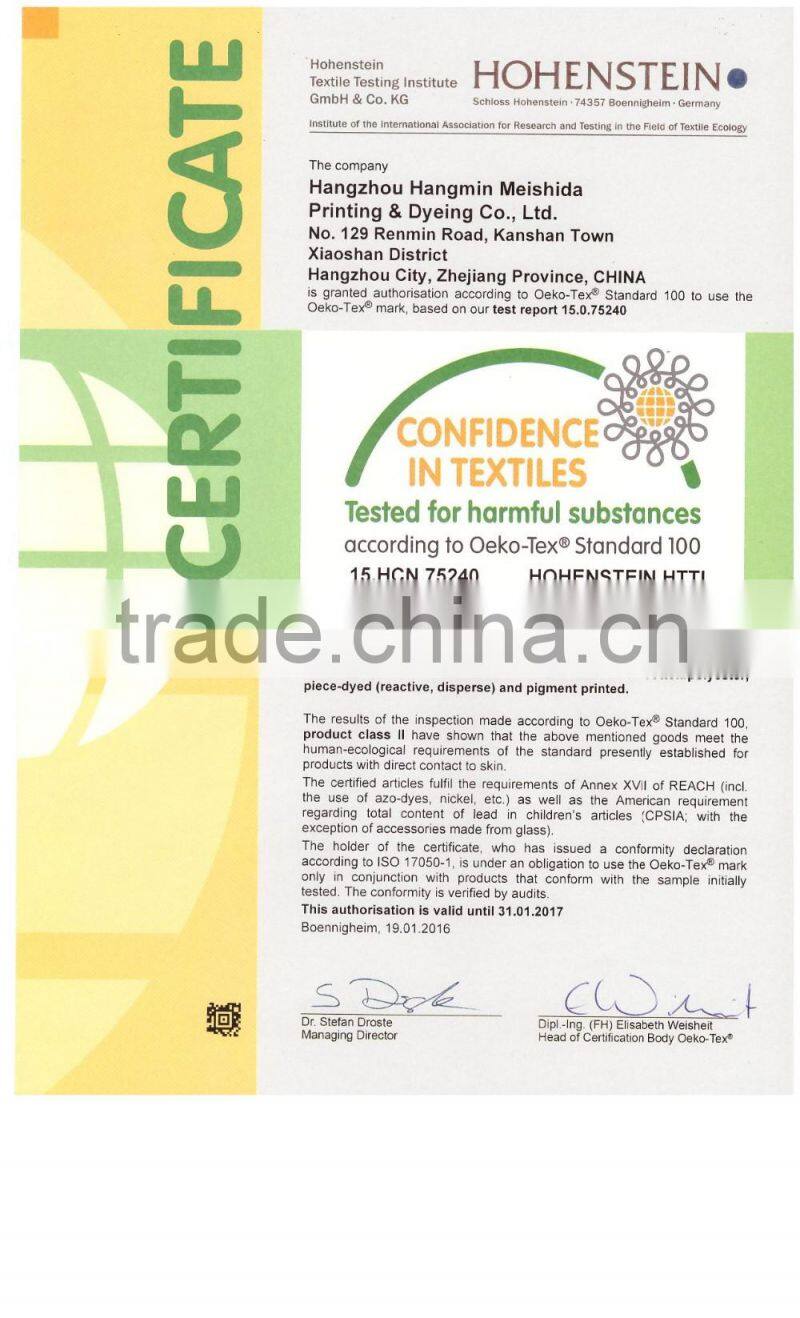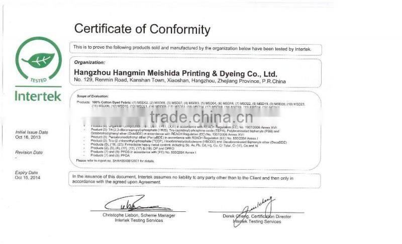 Hangzhou Hangmin Meishida Printing and Dyeing Co., Ltd is a stock company located in the South of Hangzhou,5km away from Hangzhou airport, 18km from China Light Textile City, 150km from Shanghai. Our enterprise was established in 1996, with more than 700 employees, and engages in dyeing, printing and finishing of cotton, linen/ramie, T/C,(stretch or no-stretch). We own a total asset