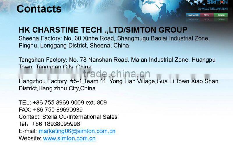 solutions for OEM/ODM in a wide range of industries, such as Consumer Electronics,Wearable,Electronics Appliances, Medical Electronics, Automobile Electronics, Instrumentation, Accessories, Telecommunication, Audio, and so on. As the leader of in-mold decoration industry, to day Simton group has established five independent organizations, including the headquarter, a US office in Boston and three IMD manufacturing bases respectively located in Shenzhen, Zhongshan and Hangzhou cities, offers an overall daily output of 100-120K pcs.
