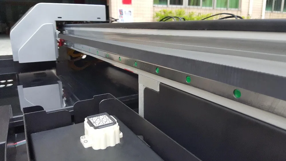 The carriage was mounted with Japan brand linear rail to driver the carriage moving with high precision and low noise, the ballscrew move preforward and backward make the flatbed more stable, the prinitng media will not be any shake when prinitng, so that the printing result will be better.Combine with the closed-loop structure circuit design to enhance the stability of the system and ensure the flatbed printing with one pass printing precision and repeat printing precision.
