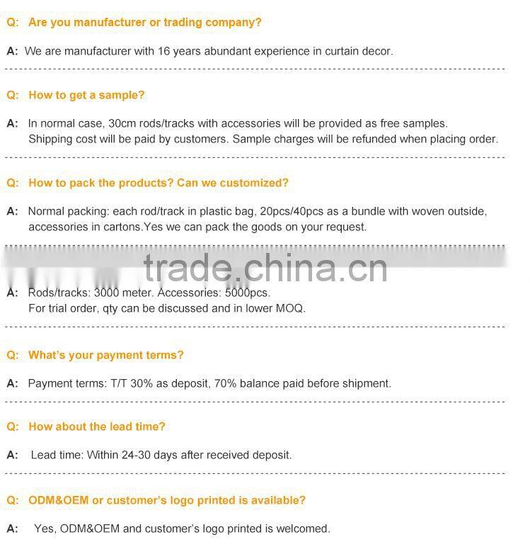 We are a professional manufacturer of curtain rod,curtain track and curtain accessories for over 15 years history in Guangdong,China,If you have any questions,send your inquiry details in the below. We will reply you as soon as possible.
