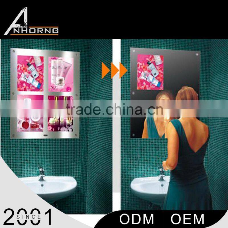 13. Advertising mirror with an infrared sensor, when people come within 1M, it automatically reduces the size of advertisement image, then a mirror turned out. When people outside 1M, it returns to full-screen playback.