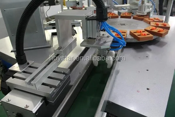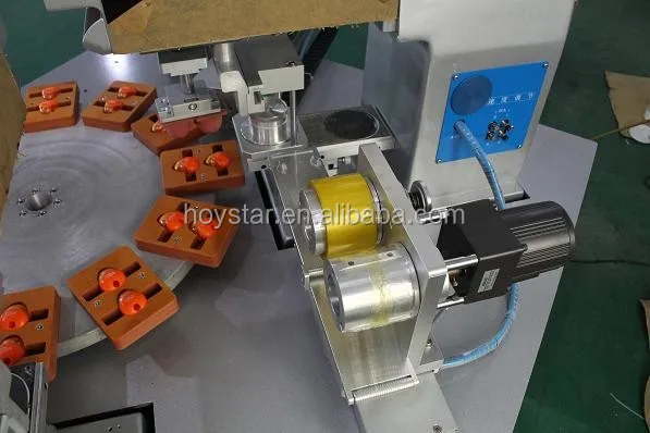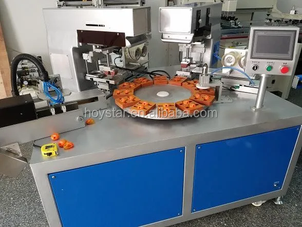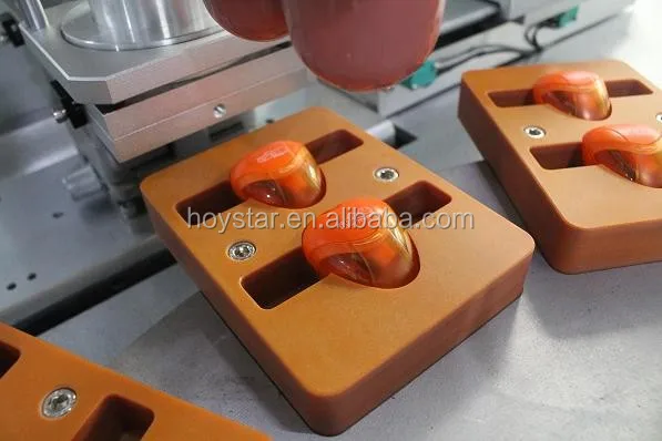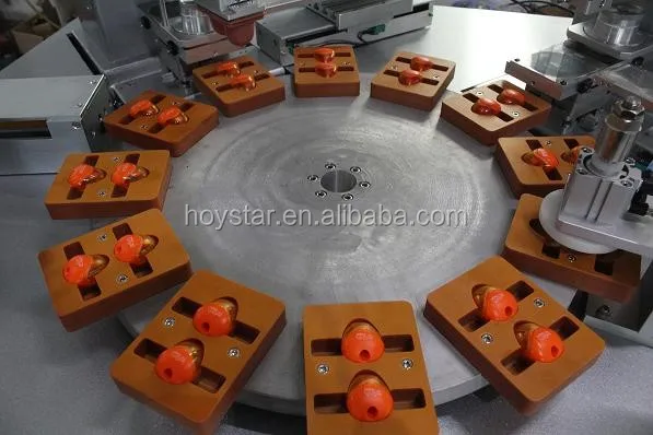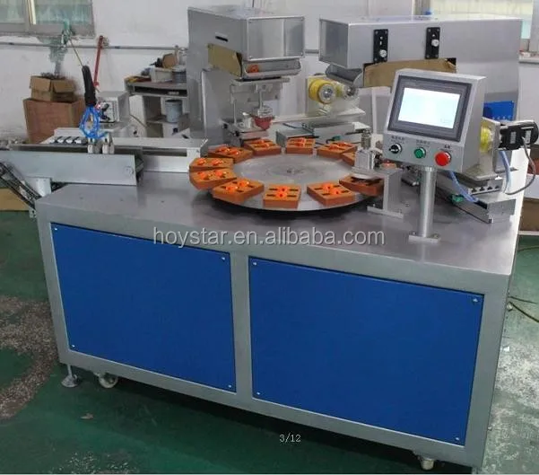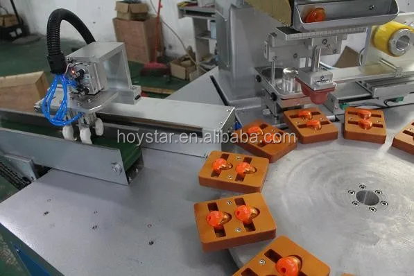 It is a rotary pad printer, conveying products by rotary type turntable. The products can be overprinted with 2 colors. Running a circle can finish one time overprint. Comparing with shuttle pad printer, it come to a high steps. It can print products with 2 color with fastly and steady.