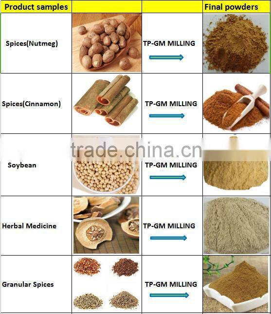 Grinder is mainly applied to food (red dates, sugar, rice, corn, starch, oats, flour, beans, peas, lentils and spices, cocoa powder, potato powder, coffee, salt, milk, onion, dehydrated vegetables, glucose , oat hull, husk, herbal flavors and fragrances), chemical (polyethylene, PVC, polystyrene, polyvinyl alcohol, limestone, gypsum, paints, pigments) grinding, especially for oily, viscous material.
