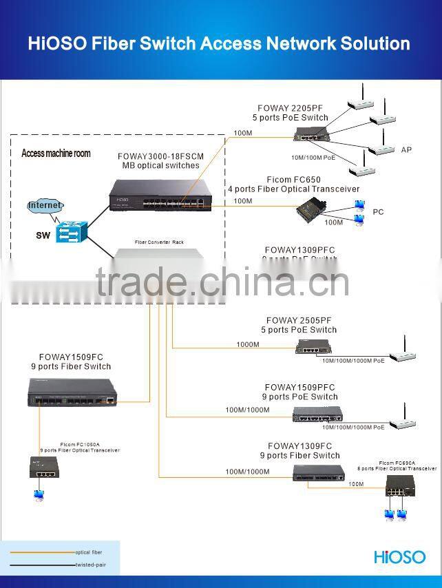 HiOSO FOWAY3000-18FSC is a 18 ports 100M and1000M hybrid all optic fiber switch. It offers 16 100M SFP fiber ports access and 2 Gigabit Combo port (100/1000M SFP port or 10/100/1000M adaptive RJ45 Ethernet optional) uplink.
