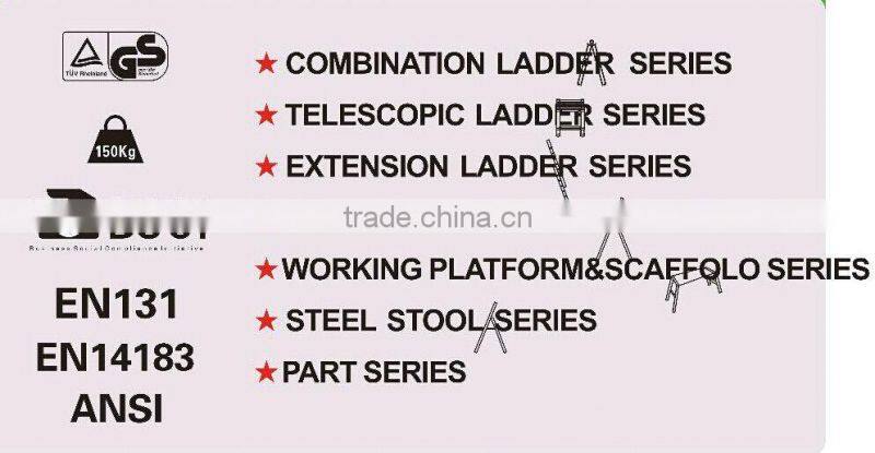 Our main produicts have Telescopic ladder series,Combination ladder series, Aluminium Household ladder series, Steel ladder series and Working platform series and so on. We also can produce similar different hardware products according to customer's request with OEM or ODM.