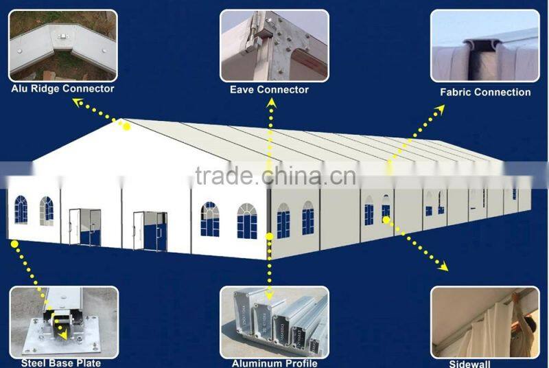 Our tent roof slope is well designed for snow and rain to slip off quickly. The roof fabric has firstly PVC coated, then lacquered with Vinyl for more smooth surface to let snow and rain slip off. Snow load exceed 0.3KN/sqm